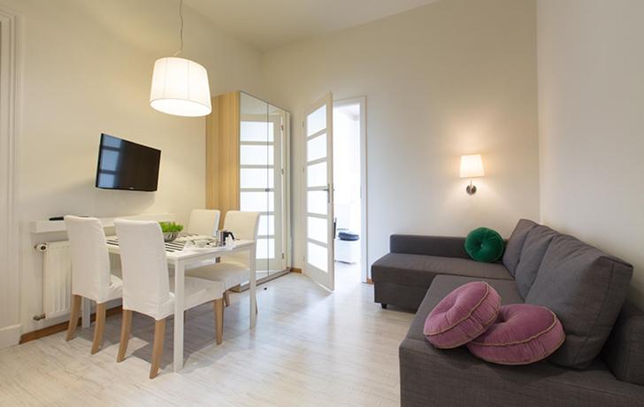 Apartament typu studio (2 osoby dorosłe) – ul. Gołębia 4. Ten apartament z oddzielnym wejściem mieści sypialnię, aneks kuchenny oraz łazienkę z prysznicem i suszarką do włosów. Posiłki można przygotowywać w aneksie kuchennym z płytą kuchenną, lodówką, zmywarką do naczyń i przyborami kuchennymi. Apartament oferuje szafę, pralkę, telewizor z płaskim ekranem i dostępem do kanałów satelitarnych oraz zestaw do parzenia kawy i herbaty. Z okien roztacza się widok na wewnętrzny dziedziniec. W tej opcji zakwaterowania znajdują się 2 łóżka. Apartament - 2 osobowy. Powierzchnia pokoju ok.: 20 mkw. ;