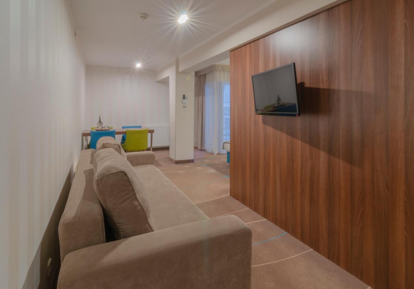 Apartament typu Junior Suite z balkonem. This suite consists of 1 living room, 1 separate bedroom and 1 bathroom with a bath and free toiletries. This air-conditioned suite includes a dining area, a flat-screen TV with cable channels a tea and coffee maker and a balcony. The unit offers 2 beds. Apartament typu Suite - 4 osobowy. Powierzchnia pokoju ok.: 25 mkw. ;