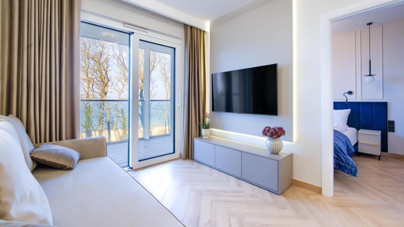 Apartament z widokiem na morze. Ten klimatyzowany apartament mieści salon, oddzielną sypialnię oraz łazienkę z prysznicem. W aneksie kuchennym zapewniono płytę kuchenną, lodówkę, zmywarkę do naczyń i przybory kuchenne. Apartament dysponuje balkonem z widokiem na morze i jest wyposażony w pralkę oraz telewizor z płaskim ekranem. Ta opcja zakwaterowania zapewnia 2 łóżka. Apartament - 4 osobowy. Powierzchnia pokoju ok.: 35 mkw.