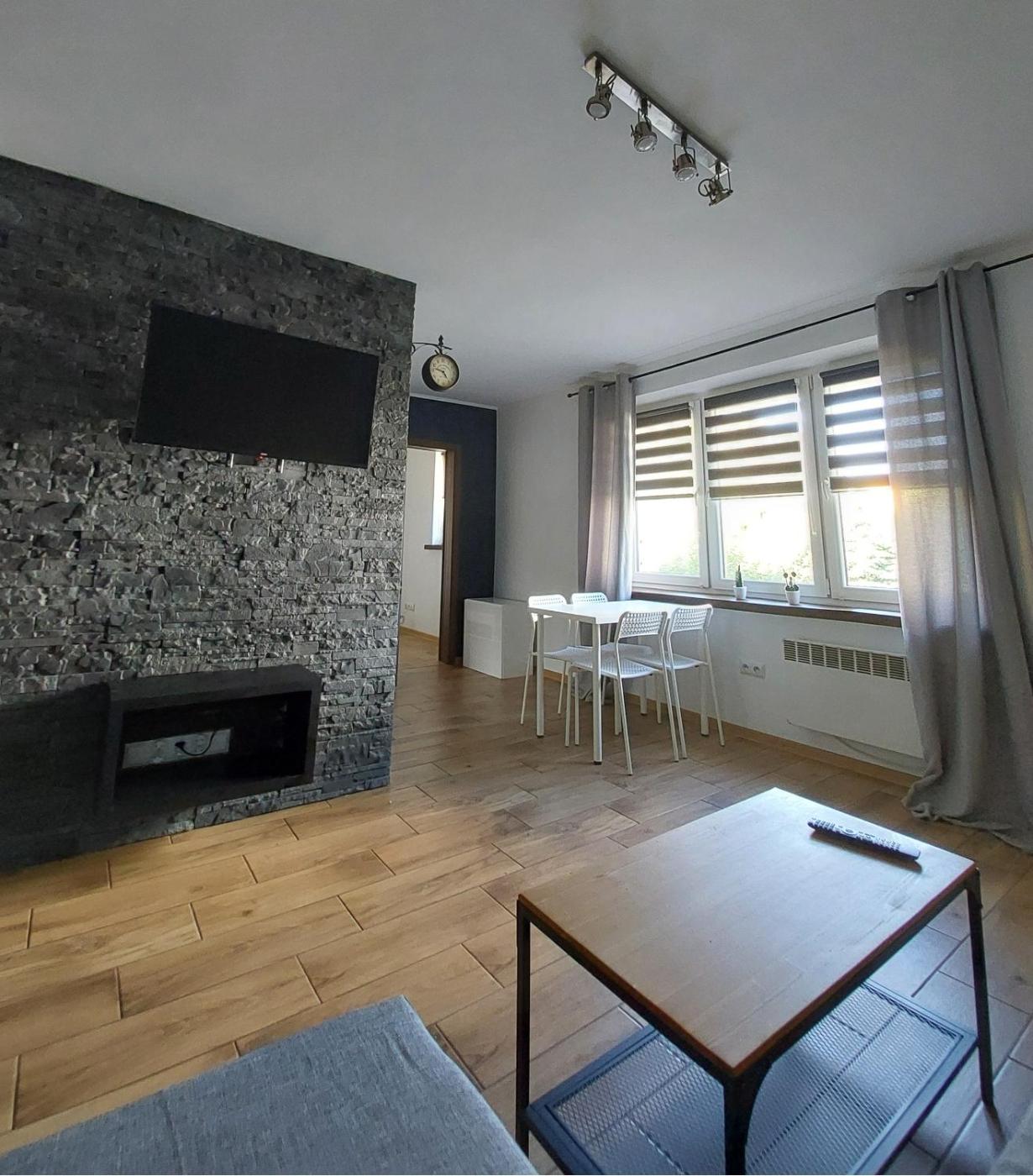 Apartament z 1 sypialnią. This apartment comes with 1 living room, 1 separate bedroom and 1 bathroom with a shower and a hairdryer. The well-fitted kitchen has a stovetop, a refrigerator, a dishwasher and kitchenware. The apartment features tiled floors, a seating area with a flat-screen TV, a washing machine, a dining area as well as garden views. The unit has 3 beds. Apartament - 5 osobowy. Powierzchnia pokoju ok.: 37 mkw.